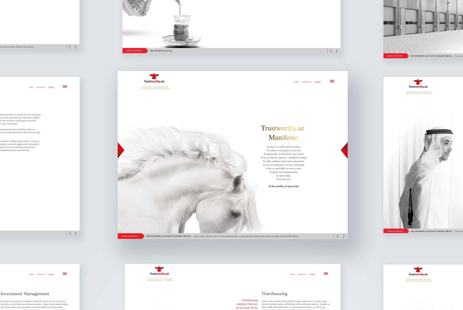 Trustworthy is an investing company with over 19 years in the market. The brief was to create a website that suites that company which is under the office of H. H. Sheikh Maktoum Bin Hasher Bin Mana Al Maktoum. The website had more just a traditional look. With its white minimalistic look, each page contains animated related grey-scale elements like the white horse that symbolise the Arabic heritage as well as the Arabic teapot for example.
